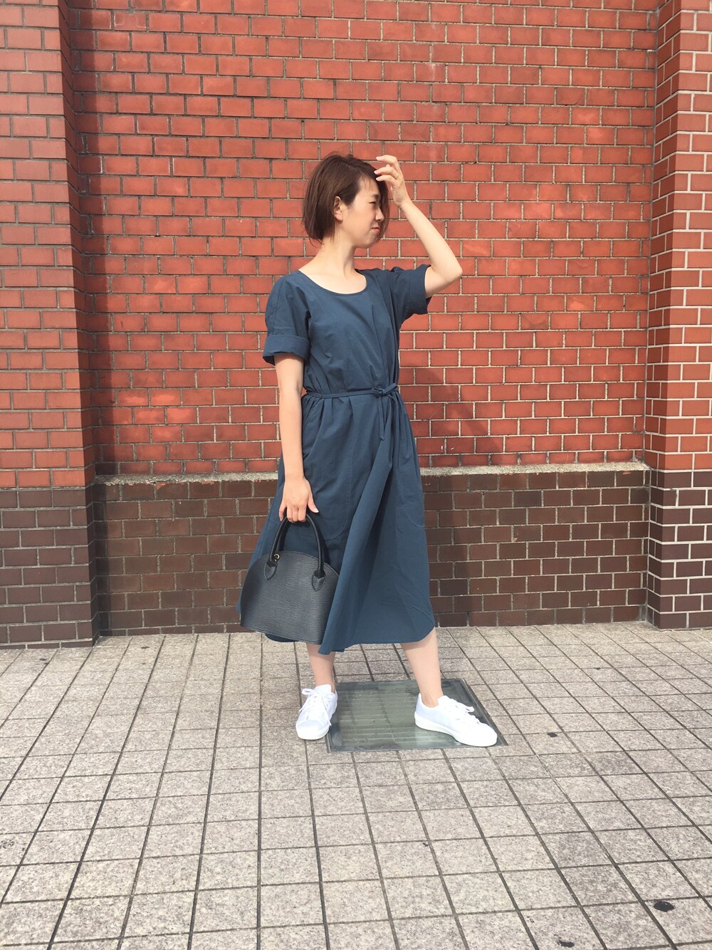 ワンピースにスニーカー リップはオレンジ気味の赤でパリジェンヌ風