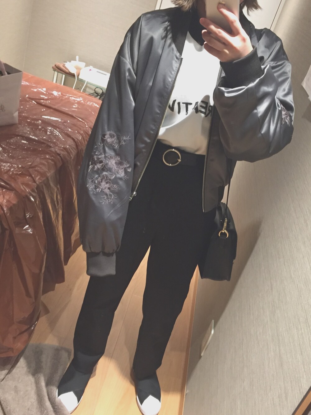 袖の刺繍💐が可愛いブルゾン 見えないけどスウェットの下にハイネックのレーストップス着てます 人生初のエステでの個室🤳