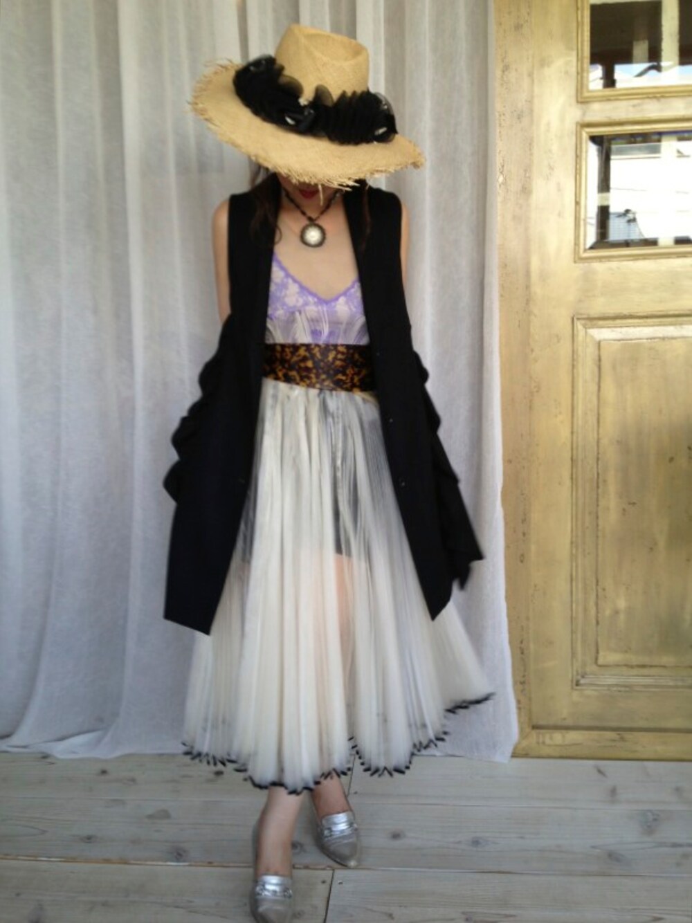 TOGAのスカートを履きたくてコーディネートしました。 今季のTOGA コレクションラインで発表されてたこのスカートは、 シースルーのアコーディオンプリーツ。 しかも、角度によって玉虫のように虹色に光る✨✨ 裾がブラックになってるっていうのも さすがTOGA✨ 歩く度に 優雅に揺れて シルエットがとても美しいのです。 共布のベルトが付いていて、ウエストより上にもプリーツ生地が立つ個性派! 中に、TOGAのショートパンツを合わせてます。 共布のベルト付いてるけど、 なんとなくべっ甲風のベルトをON💗 これもTOGA! すごくボリューム出るデザインなので ロングジレで抑えました。 このジレも、サイドに大きなポケット付いてたり、 フリルが施されていて、お気に入り!!
