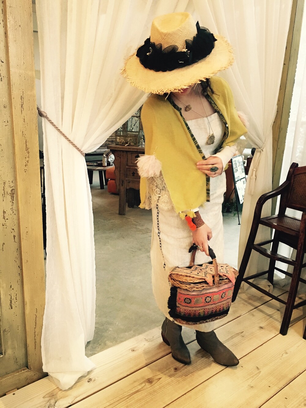 リネンのエプロンにル シャルム ドゥ フィーフィエ ファーファーオリジナルのカシミアケープをON。 ピンクのオーストリッチファー、オートクチュールレース、チクチクステッチ‥‥と、大好きなものがギュッと詰まったお気に入りです❤️ ラファア帽も被りたいから被る❤️ 自身のブランド pr'esent プレザン のボンボンブレスレットとカゴバックを持って✨✨