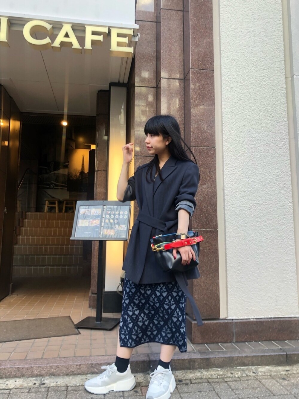こんにちはMIDWEST名古屋店の堀です!Ritoのジャケットでかっちりとキメつつも、スニーカーでハズしてみました!タイトスカートでバランスを取るのがコツです☆