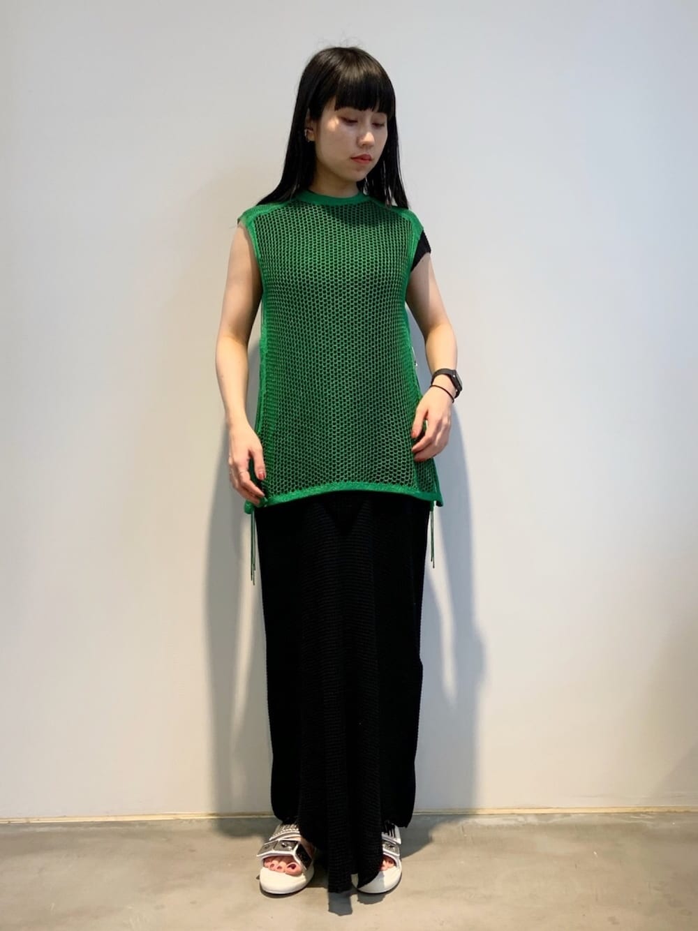 こんにちは!MIDWEST名古屋店の堀です!今日はTANのワッフルニットワンピースにサンダルでスタイリング!グリーンのメッシュがハズしポイントです!
