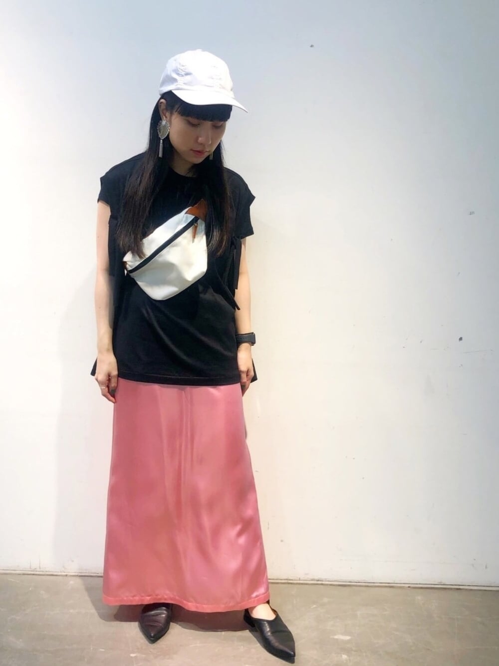 こんにちは!MIDWEST名古屋店の堀です!スポーツミックスをテーマにスタイリング!白のキャップとbagを合わせてまとめてみました。ピンクのサテンスカートがポイントです!