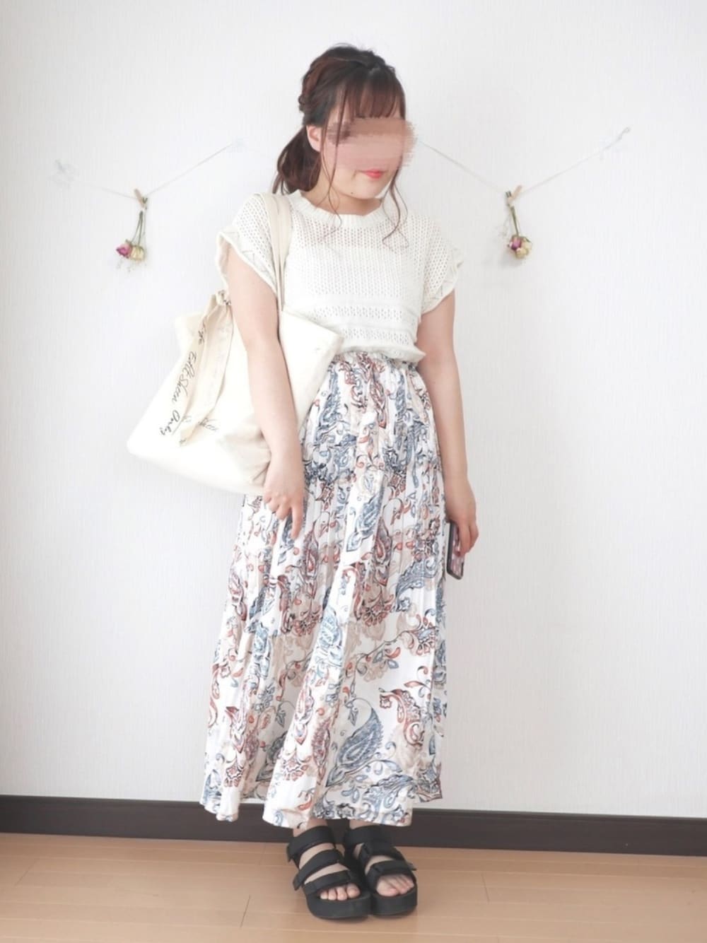 いつもご覧いただきいいね、お気に入り、フォローありがとうございます😊 今回はペアペアさんのペイズリー柄プリーツスカートを使ったコーデ! このスカート はペイズリー柄が爽やかで可愛いのです💕消しプリーツになっているので風に吹かれるとふわっとしたシルエットになって女の子感満載です🌼 トップスと小物はモノトーンで揃えることでまとまりの良いコーデにしました! サイズ トップス M スカート F サンダル M 154cm ぽっちゃり プチプラ instagram→nae.tomizawa