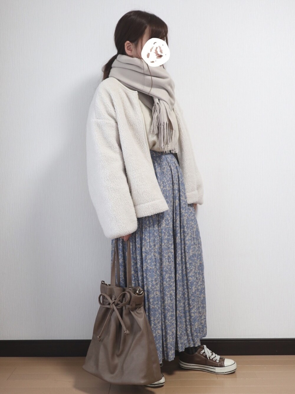 いつもご覧いただきいいね、お気に入り、フォローありがとうございます😊 今回はしまむら×プチプラのあやさんコラボのスカート を着てみたコーデ! このスカートはくすみブルーや花柄が可愛くてお安いブランドさんではほとんど見ない高見えスカートだと思いました💓 こんなに可愛いのに1969円で購入できました🙏🏻✨ 春になっても着られる万能アイテムですね💡 マフラーとボアブルゾンで冬の可愛らしいコーデにしてみました! サイズ トップス M スカート L アウター XL 154cm ぽっちゃり プチプラ instagram→nae.tomi