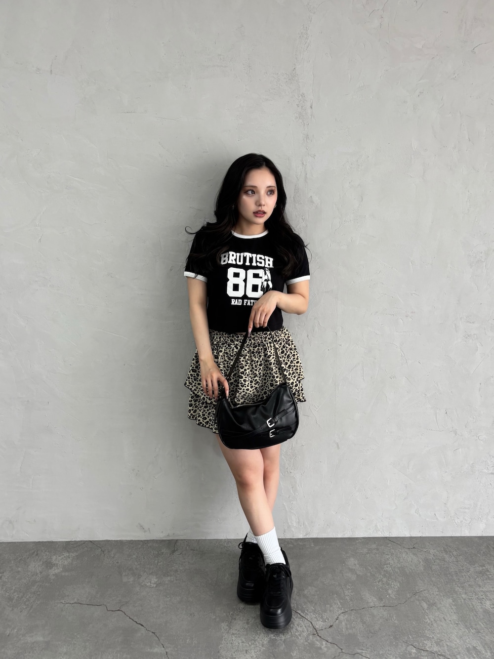 【Tops】 トレンド感のあるスポーティーさとカジュアルさを兼ね備えた、着るだけでこなれ感の出るリンガーTシャツです💫 首元や袖口のバイカラーが、シンプルながらも しっかりアクセントになってくれて、 コーデ全体のバランスを引き締めてくれます✨ コンパクトなシルエットで、スタイルアップもばっちり狙えるのが嬉しいポイント💭💛 【Bottoms】 全体にあしらわれたレオパード柄がコーディネートに 華やかさをプラスしてくれる、主役級のアイテムです🐆✨ 落ち感のある美しいシルエットと、ボリューム感のあるダブルフリルが、女性らしさをぐっと引き立ててくれます💖 ウエストはゴム仕様なので着心地もラクちん🩶🩶 裾にかけて広がるラインが、脚をすらっと長く見せてくれるのも魅力のひとつです✨ パンツ型の裏地がドッキングされているので、 これ1枚でも安心してご着用いただけます🕺🏼