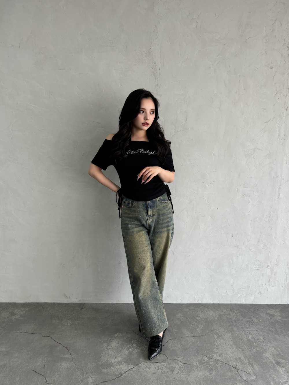 【Tops】 伸縮性のあるやわらかい生地がボディラインにフィットして、スタイルアップ効果もばっちりです🌿 ヘルシーな肌見せが叶うオフショルデザインも魅力のひとつ◎ サイドのドロストを絞ってギャザーを寄せれば、 シルエットに変化をつけられるのも嬉しいポイントです🥹💕 トレンド感のあるワイドボトムスとの コーディネートもおすすめですよ✨ 【Bottoms】 キラッと存在感のあるオーロラカラーのラインストーンが、 コーデのアクセントにぴったりです💎💞 ゆったりとしたストレートシルエットのデニムパンツで、 ベーシックなデザインなのでどんなトップスにも合わせやすく、普段使いにも大活躍◎ ショート丈のトップスと合わせれば、 バランス良く今っぽい着こなしに仕上がります🙌✨ フロント・バック両方に便利なポケット付きで、 機能面もばっちり✨✨✨ ワードローブに追加したくなるおすすめの1本です💫