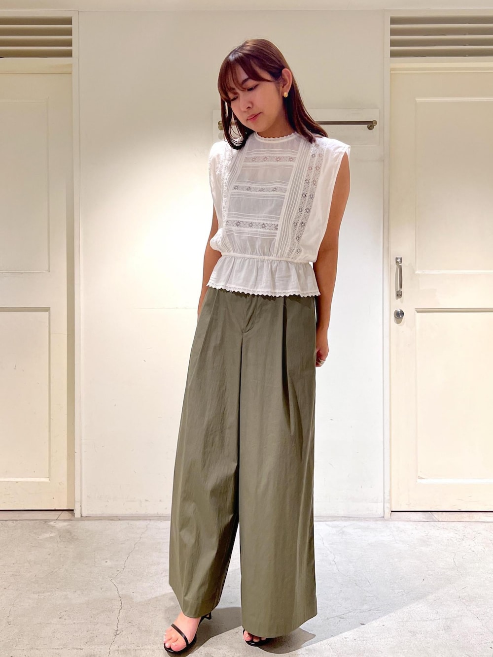 トップス:フリーサイズ パンツ:フリーサイズ サンダル:37 アクセサリー:私物 太めのワイドパンツなので、トップスはコンパクトにまとめてバランスよく◎ トップスのブラウスはウエストにギャザーが寄っているのでメリハリがあります。 履きやすさ抜群のこちらのワイドパンツもおすすめです!