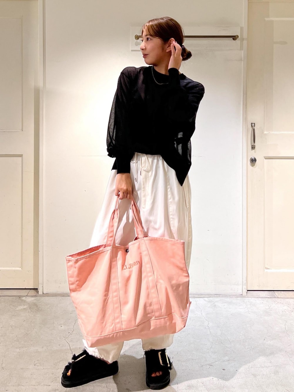 トップス:フリーサイズ パンツ:フリーサイズ サンダル:37 品番SBA63050 バッグ:フリーサイズ アクセサリー :私物 前シーズンも大人気だったL.L.Beanの別注トートバッグ。気分も明るくなるカラー展開、収納力たっぷりでおすすめのアイテムです。