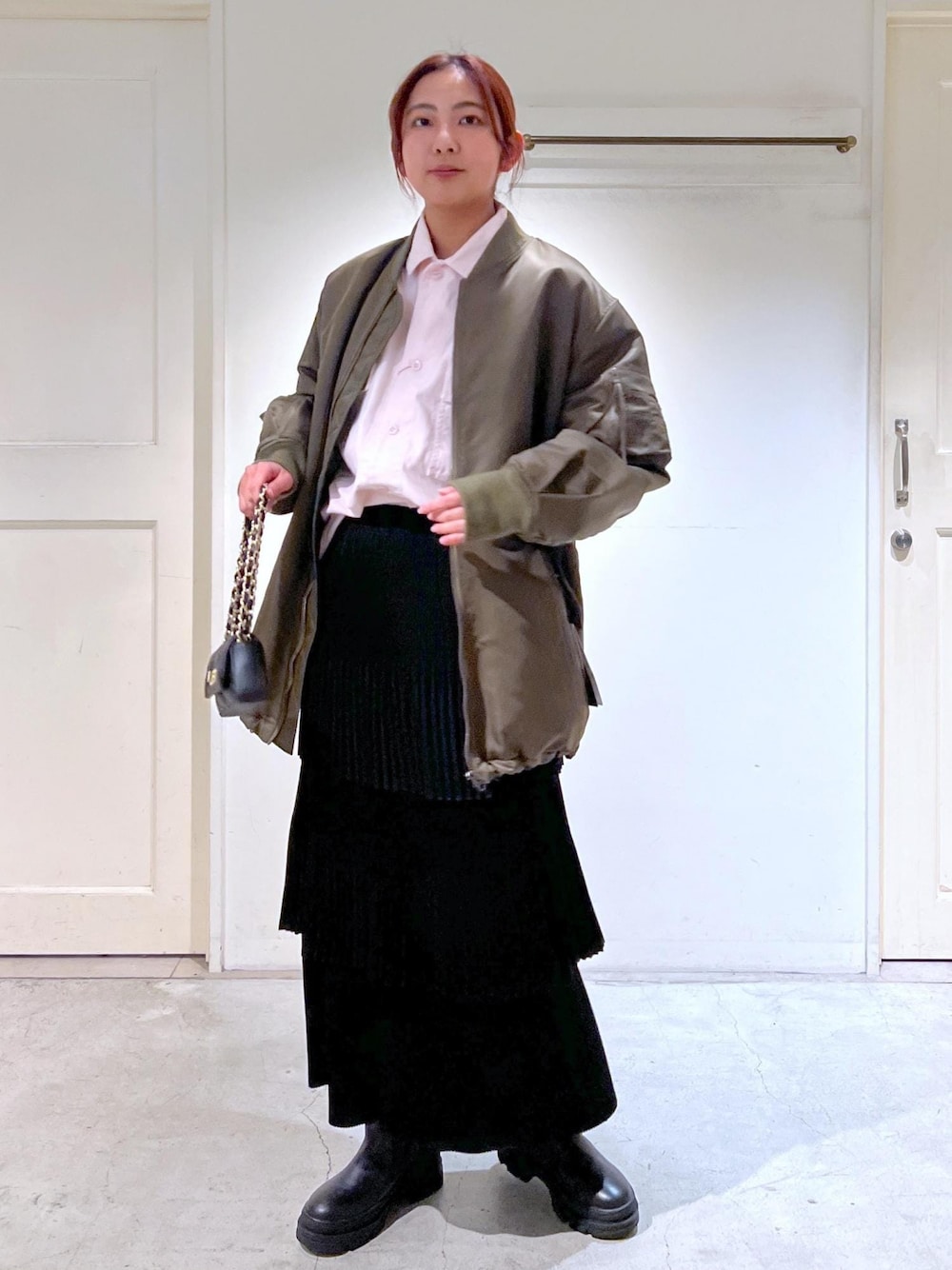 アウター:フリー トップス:お問い合わせ番号 SBH54120 スカート:フリー バッグ:フリー シューズ:私物 大きめゆったりシルエットがお気に入りのサイドジップミドルMA-1。 スカートが甘めなので、他のアイテムはカジュアルにまとめてバランスを意識しました!