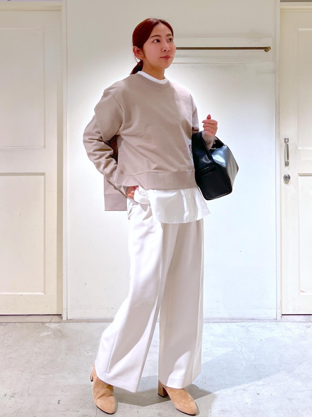 トップス:お問い合わせ番号 SHM33950 ブラウス:フリー シューズ:フリー パンツ:S バッグ:フリー ショートロゴスウェットも、ブラウスと合わせて子供ぽくなりすぎないようなコーデを意識しました。 こちらのコーディネート、すべてSALE対象品となっております♡ 店頭・オンラインではFINAL SALEも開催中です。ぜひご覧ください。