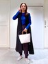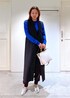 ブルーのトップスを着たくて、カジュアルになりすぎないジョガーパンツとリネンの生地感が好きなジレと合わせてみました。 足元はシルバーで華やかに!