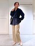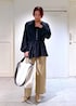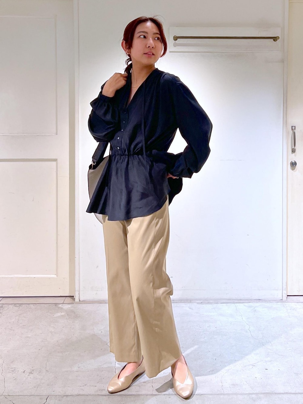 シューズ:私物 少し通勤なども意識してパンツはすっきり丈のサイズをチョイスしてみました。綺麗目にきりっとまとめたいときは、パンツの丈は長すぎるものより、ジャストくらいがおすすめです! ブラウスはギャザーがポイントになって印象的。ヒップも隠れて安心です。