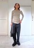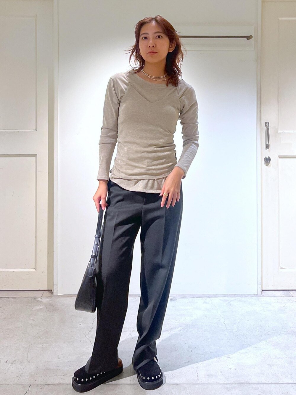 セットアップのトップスを使ってレイヤード。 マニッシュに合わせたかったので、綺麗めなパンツに色味も抑えてシンプルなアイテムを選びました。