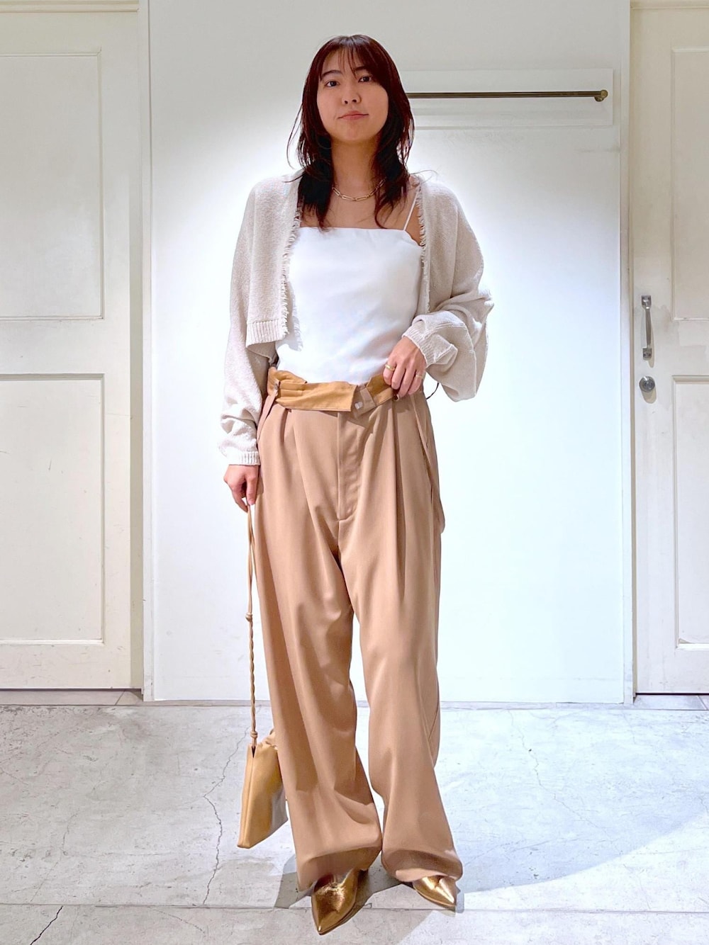 ショート丈でオールインワンやワンピースなどとも合わせやすいカーディガン。 去年も人気だった和紙を極めて細くし糸に撚りこんだドライタッチな素材感のペーパーヤーンシリーズより新作が登場です。 アクセサリー:私物