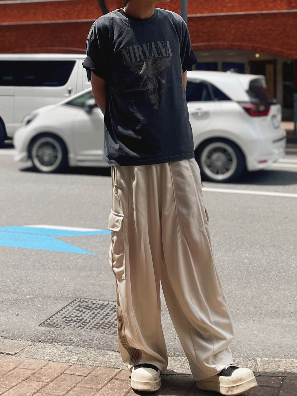 今日はVINTAGEライクなANDRAPのNIRVANAのTシャツに、ANDRAPの無地ブラックTをレイヤードして奥行きのあるスタイリングに。 ボトムスは白ではなく、ベージュにすることでトップスとのバランスを取れるように工夫しました❗️ そして、needlesとの別注カーゴトラックパンツで程よくルーズに、足元は厚底スニーカーでスタイルにメリハリを意識🔍 バンドTのグランジ感に、ツルッとした素材感のパンツを合わせることでストリート×モードMIXに。 レイヤードでシンプルになりがちな夏のTシャツスタイルに差別化を。 ぜひ真似してみてください◎