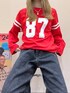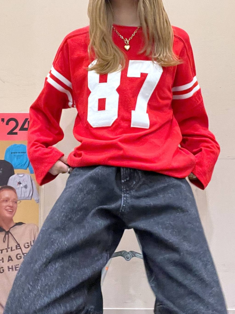 最近お店でよくみるナンバリングT 目を惹くレッドがかわいい!! 袖口が広くてラメLSのレイヤード合わせも かわいいです!!✨