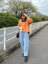 オレンジニットとブルーデニムの爽やかコーデ! 小物はブラックでまとめて統一感を。 ふわふわのシャギー素材で着心地抜群なカーディガンです。