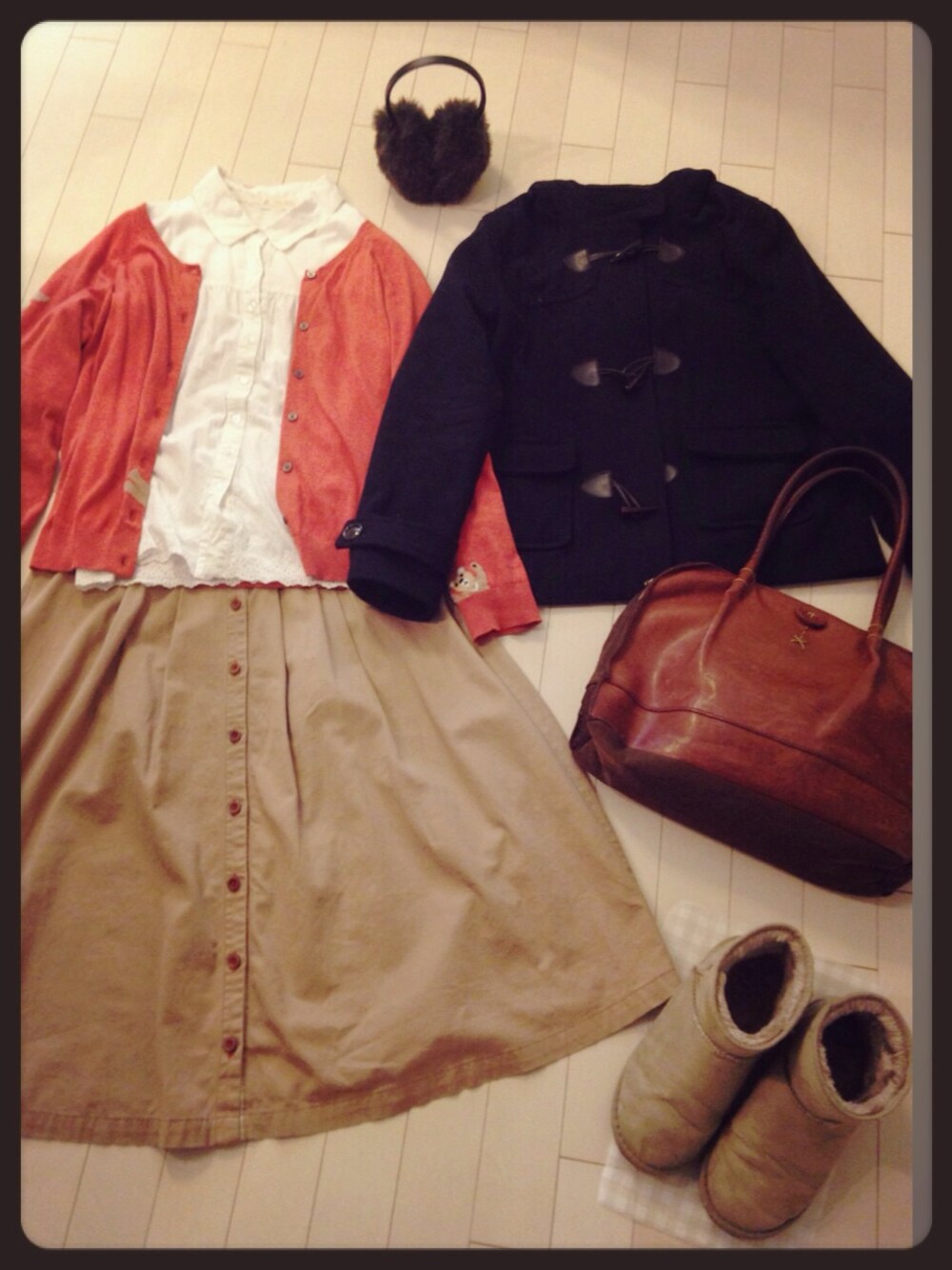 ダッフルコート/古着 カーディガン/niko and... シャツ/soulberry ロングスカート/ブランド不明 耳あて/UNIQLO ムートンブーツ/ブランド不明 ブランド不明多くてごめんなさい(^^;;
