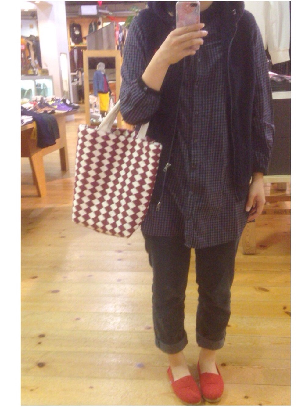 母からのお下がりのシャツワンピースに ジムフレのボアベストにサイのコーデュロイパンツ 小物は赤のトムスと赤のトートで色を。