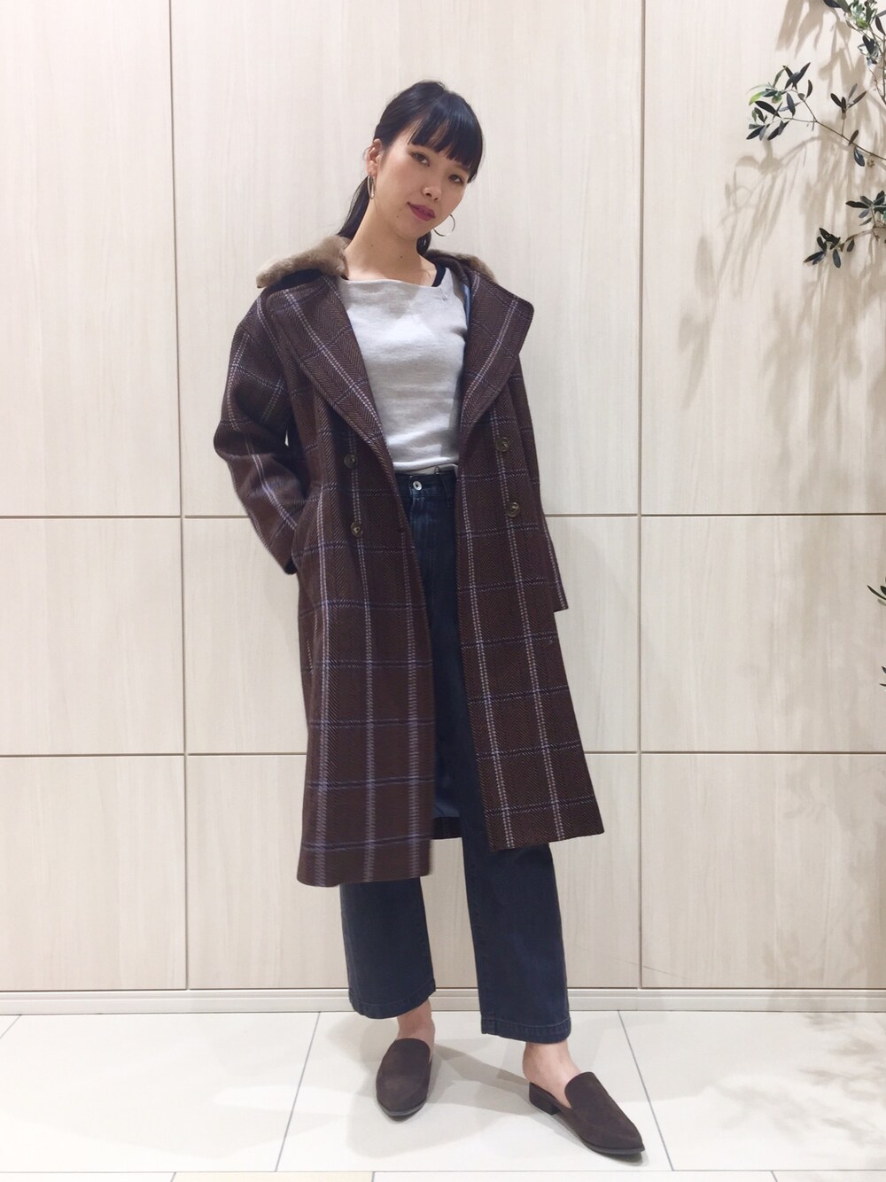 着用コーデ:488件な つ み(UR Store アミュプラザくまもと)のピーコート「ヘリンボーンチェックファーカラーコート」を使ったコーディネート