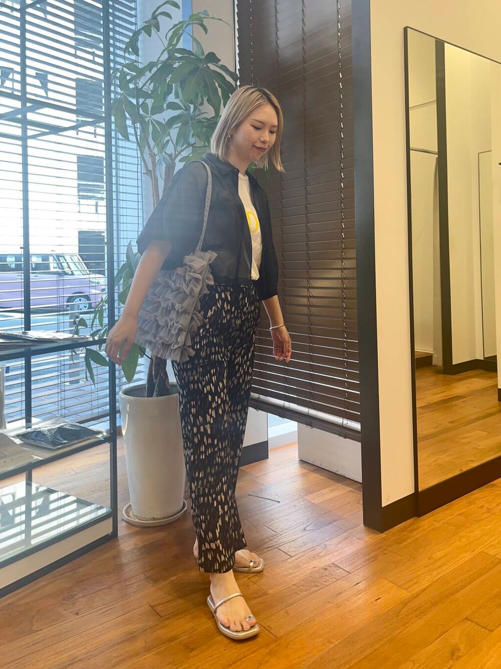 いつもご覧いただきありがとうございます! 今からすぐ活躍しそうな新作アイテムでコーデ★ シャツは艶のある生地でカジュアルすぎない! 袖がたっぷりなのがかわいいです。丈が短くバランス◎ 主役はパンツ!柄もので存在感大!! どちらもさらっとした素材感なので快適です!