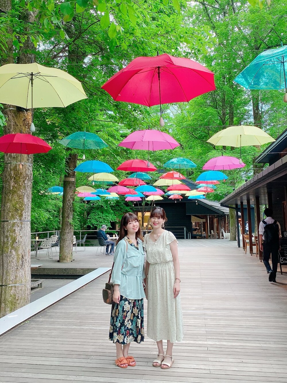 軽井沢旅行🌿 ハルニレテラスのアンブレラスカイ☂️🌈 女子旅コーデ✨