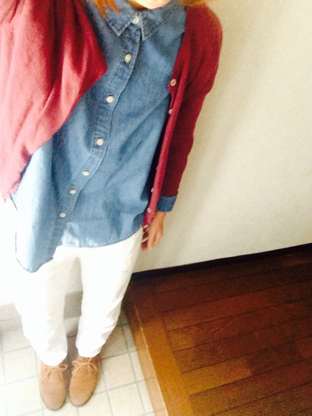 シルバーウィーク2日目! 夕方から出勤です✌️ デニムと白ではシンプルなので もう少し秋っぽくしたくて 紫のカーディガンを合わせました!