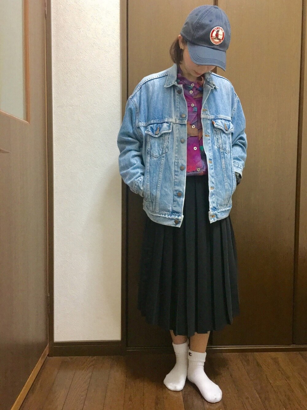 キャップはSt.Louis州の野球チームのもの Gジャン、トップスは古着 プリーツスカートとピアスはGU 靴下はChampion スニーカーはNikeのAirmax90GS