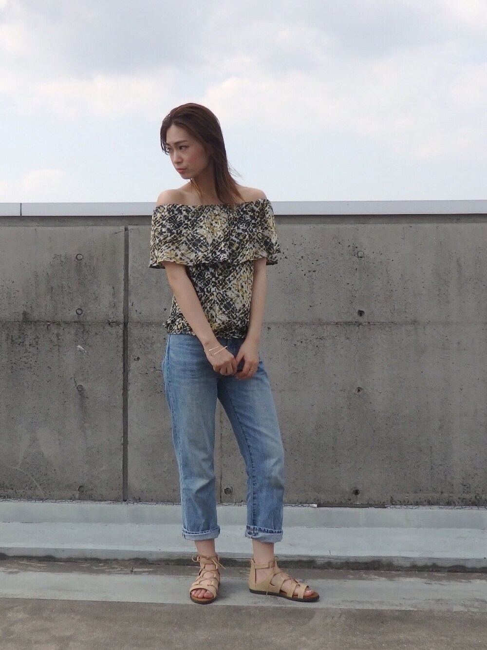 オフショルコーデ💘 いまの季節は柄物がすごく着たくなります、、、! 女性らしいシルエットになりすぎないように今日はボーイズデニム👖を合わせてみました◡̈⃝︎⋆︎* instaも毎日更新してます!🌟 → @natsumi__morita