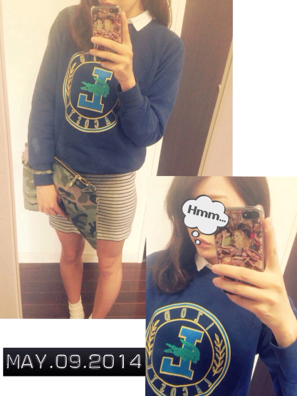 スウェットトレーナー:LACOSTE(used) シャツ:H&M タイトスカート:f21 クラッチバッグ:dholic 写ってないけど足元はNIKEのエアフォース♡ 高円寺で買った1900円のラコステ めちゃめちゃお気に入り😘