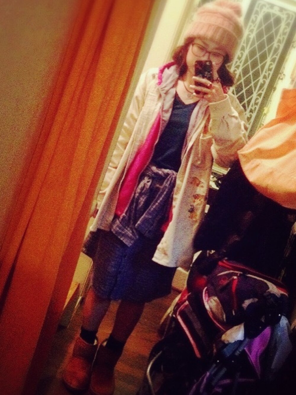 アウター代わりに着たコーデュロイ素材のメンズもののシャツは、ミッキーやプルートのワッペンが付いてます(๑¯ω¯๑) ロングワンピをスカートにして着ちゃいましちゃいました(*´∀`) ウエスト位置までボタンを留めて、腰でしばるだけ! 超簡単なのでオススメです♡