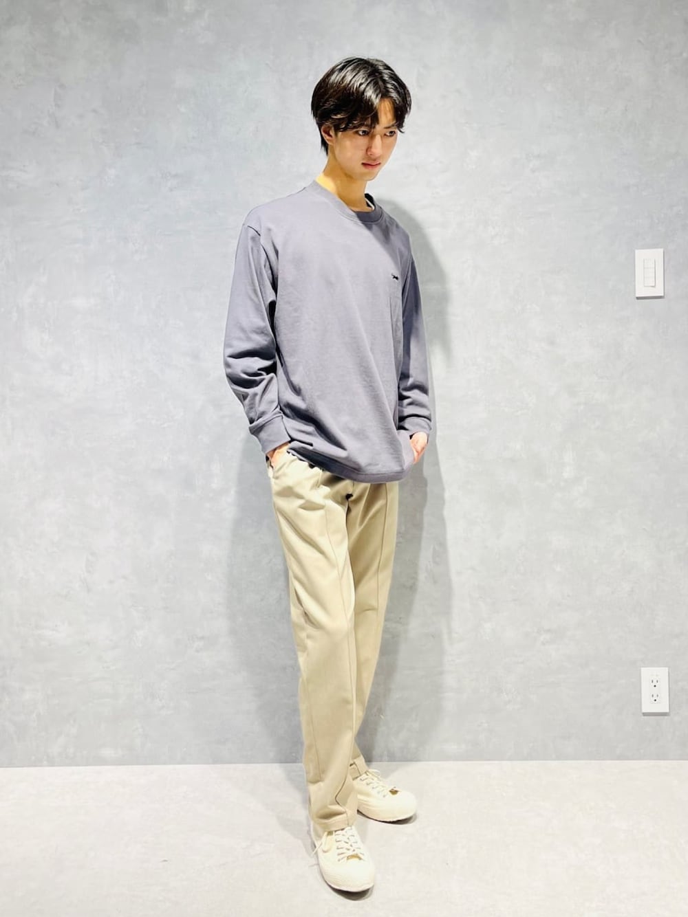 【サイズ感】 トップス 標準的です。 パンツ 標準的です。 【素材感】 トップス 着心地いいです。 パンツ 着やすいです。 【コーディネートポイント】 ロンTに明るいパンツで合わせてシンプルに組んでみました。
