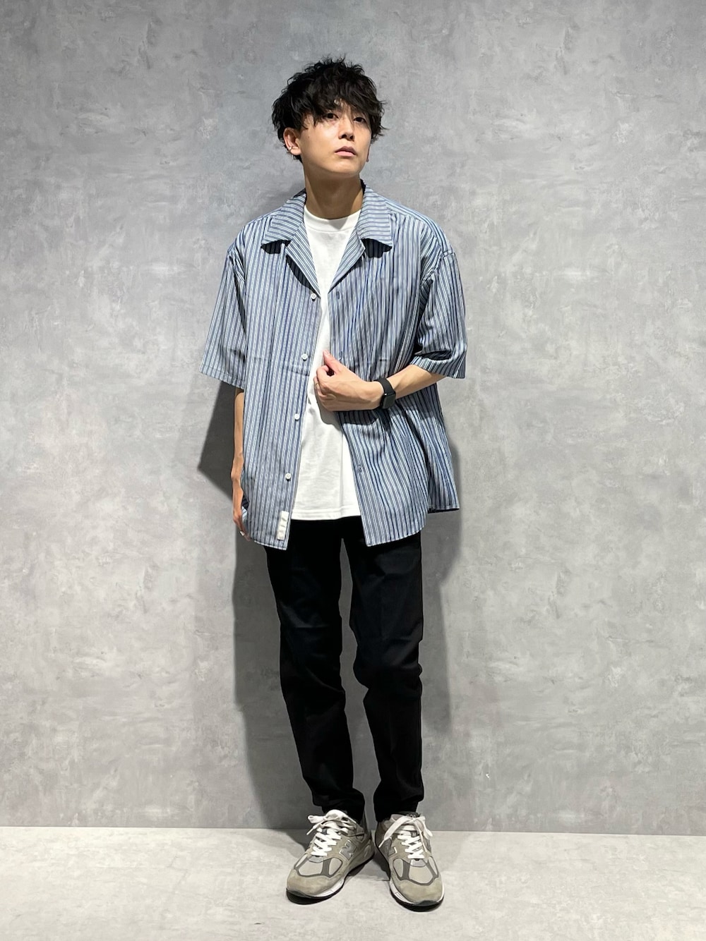 青のストライプシャツが爽やかな印象を与えてくれて、清潔感も出ます! またストライプはスタイルアップの効果もあるので、おすすめですよ! この春夏のデートや日常使いにぜひ😊