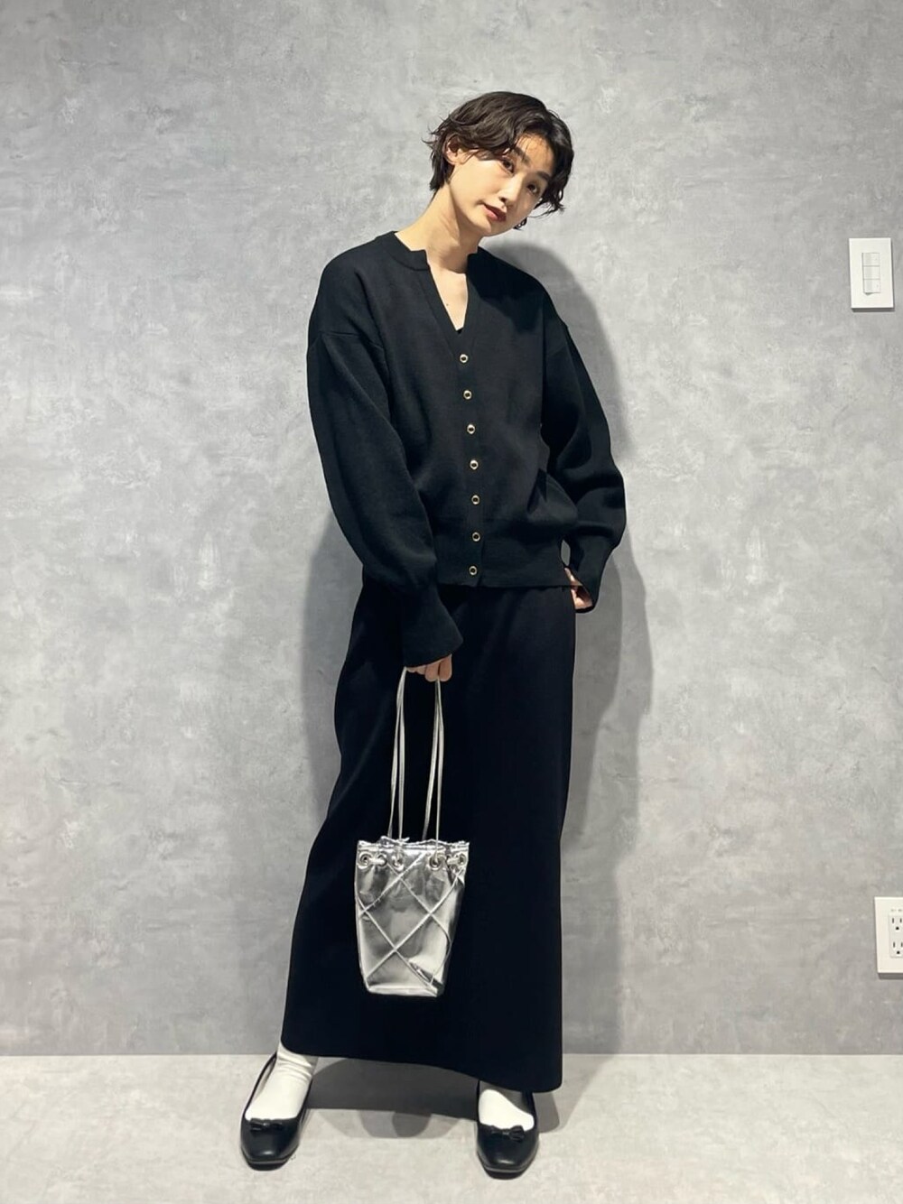 【サイズ感】 トップス オーバーサイズめ スカート ウエストゴムでちょうど良い。 【生地感】 トップス ニット生地 スカート ニット生地。 よく伸びて歩きやすい。 【コーディネートポイント】 ワントーンコーディネートです!シルバーのバッグがアクセント!
