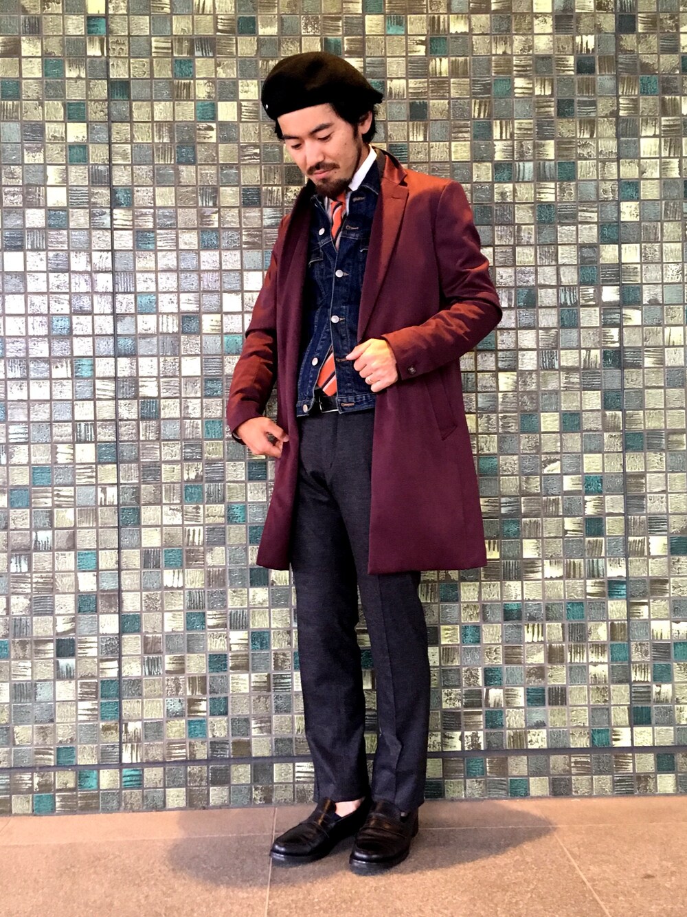 今の時期にぴったりな薄手のチェスターコートです。デニムジャケットをインして、カジュアルミックス。