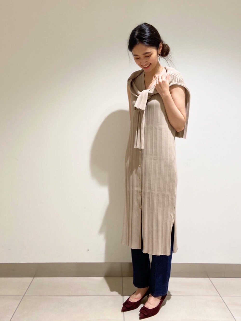 *cardigan CLEAN FEEL KNIT リブクルーカーディガン 着用サイズ 36 *one-piece CLEAN FEEL KNIT リブジレワンピース 着用サイズ 36 *pants シーンレスデニム/センタープレステーパード 着用サイズ 36 スタッフ身長 158cm