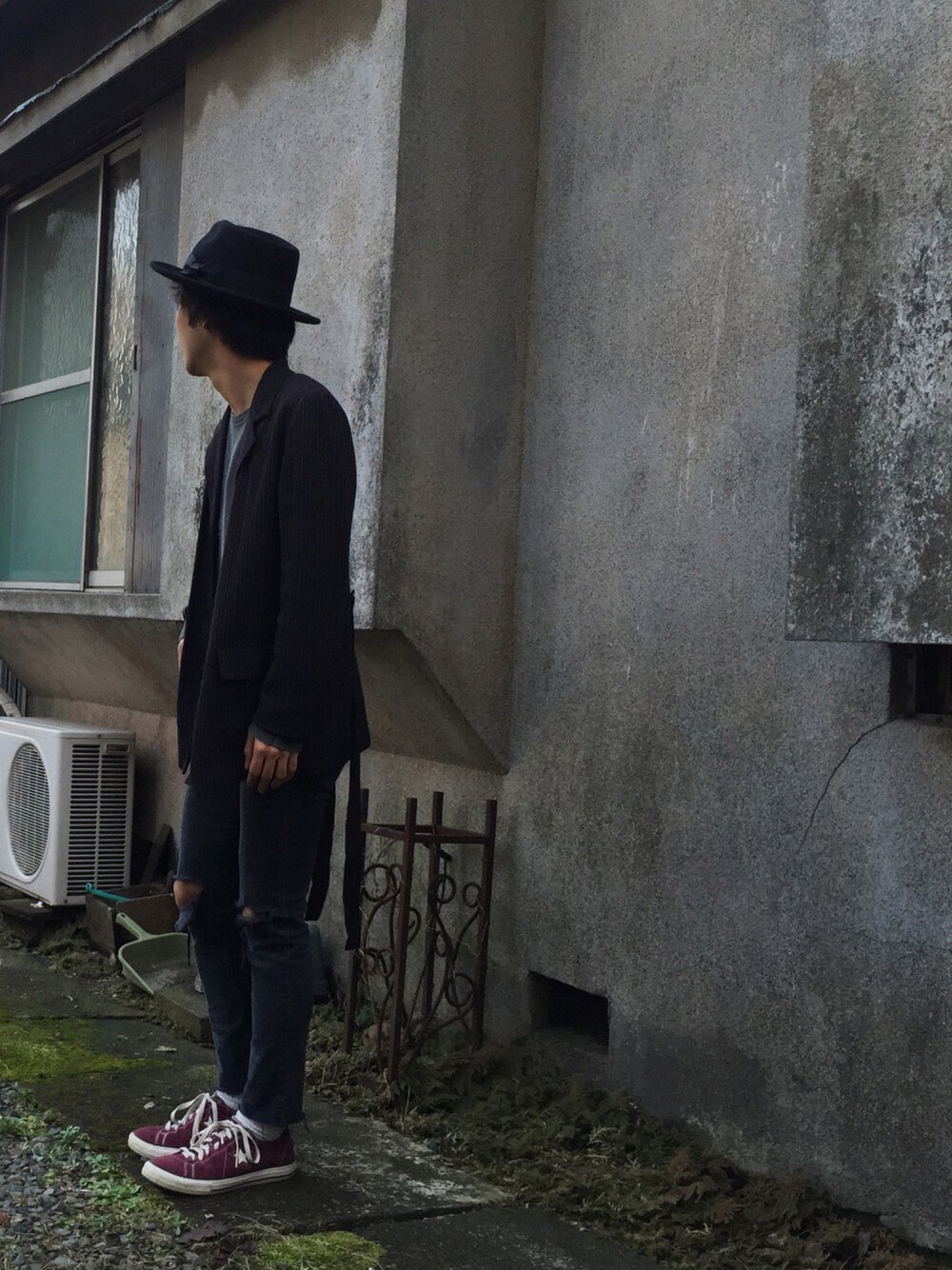分かりづらいですが、デニムの裾はカットオフになってます。 hat : SCALA jacket : used cutsew : used pants : used Levi's510 sneaker : used CONVERSE ONESTAR