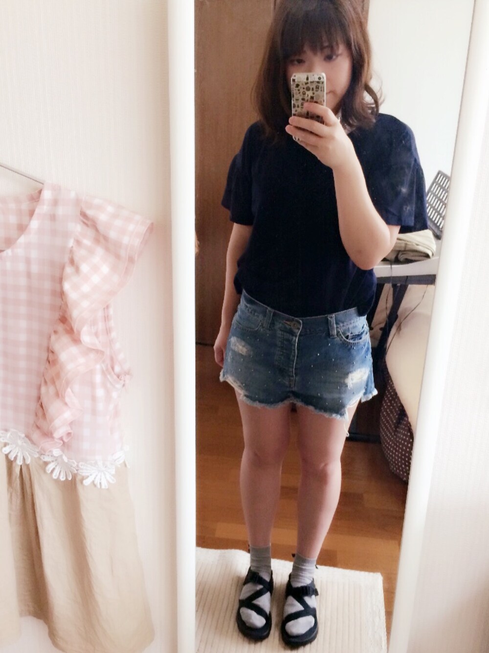 無地カットソーにビジュー付きつけ襟を合わせてシンプルに。 Chacoのサンダルでカジュアルコーデです(^^)