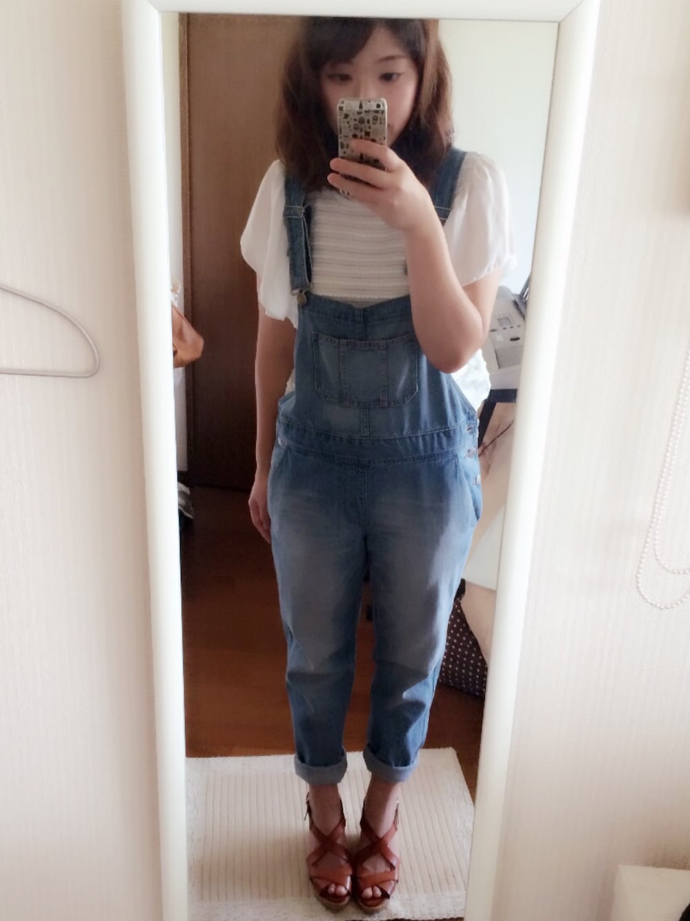 ローリーのオーバーオールが主役! カジュアルすぎないように、シフォンの切り替えトップスとヒールを合わせました(^Д^) それにしても暑い・・(;_;)