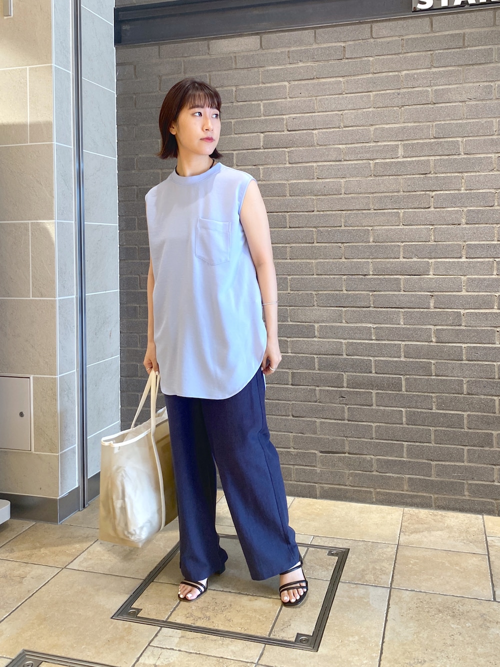 ブルーワントーンコーデ🫐 サラサラで涼しいブラウス×生地が柔らかいけどすっきりシルエットなリネンパンツ◎