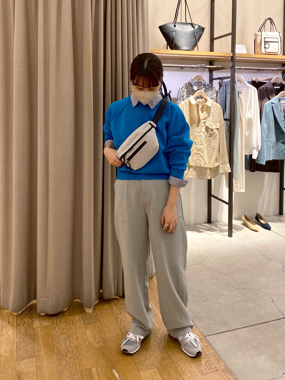 キャンパスルックコーデ🎗 ブルーのニットは1枚でも可愛いですが、シャツとレイヤードしても可愛い! 全体的にブルーグレー系にまとめてみました。
