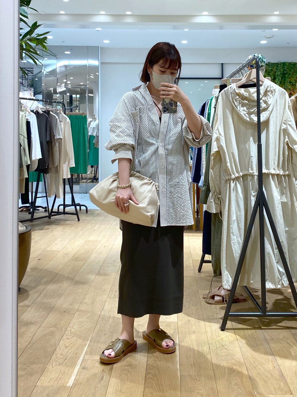 オーバーサイズシャツにはタイトスカートですっきりに。 ベアワンピをスカートとして履きました! 普通に履いて丈が短め(私的に)だったので足元は重ために。