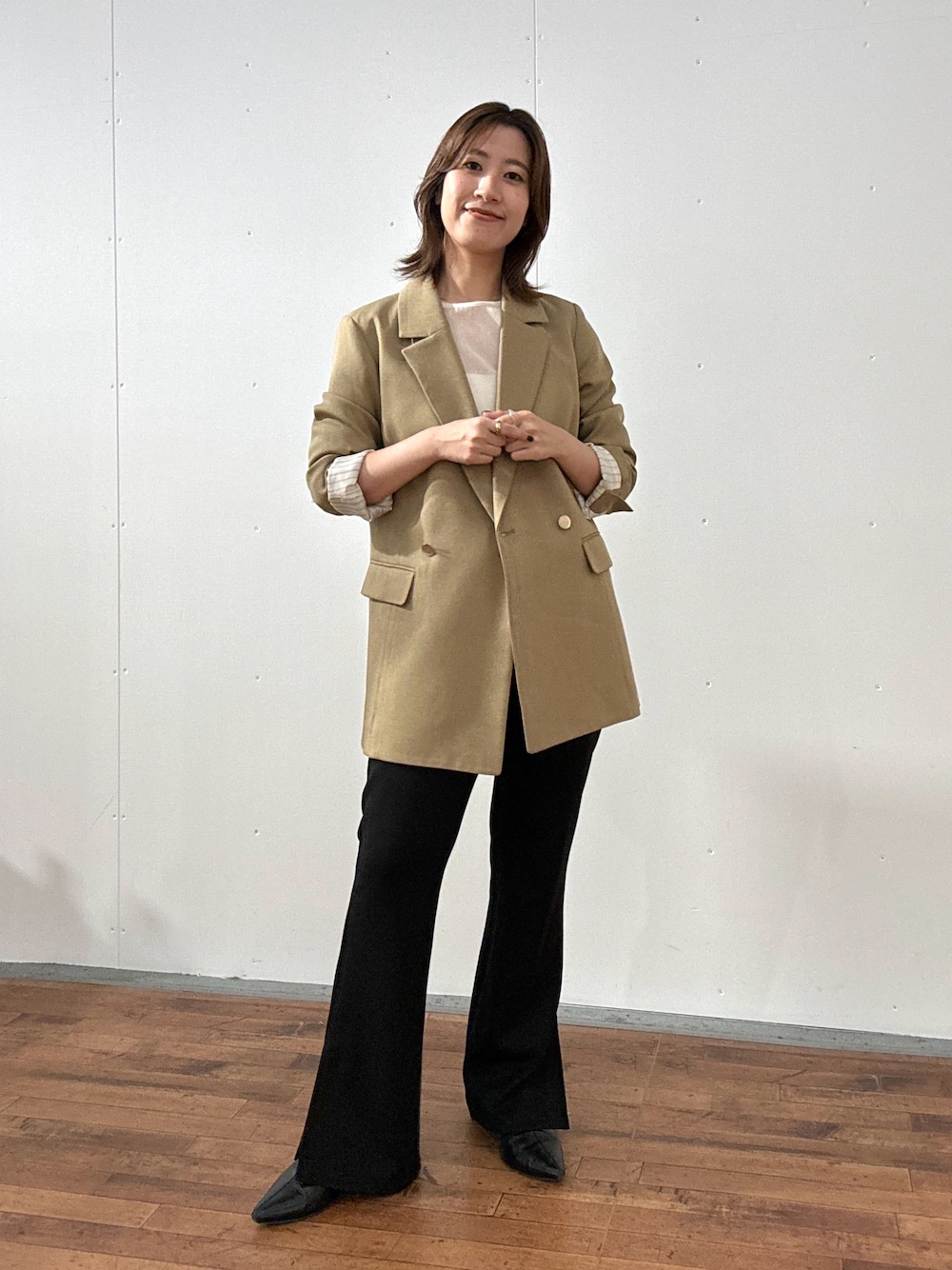 ジャケットが少しゆったりめなサイズなのでパンツはすっきりめなものを選びました。 小柄さんはジャケットの袖を折って抜け感出すのがおすすめ!