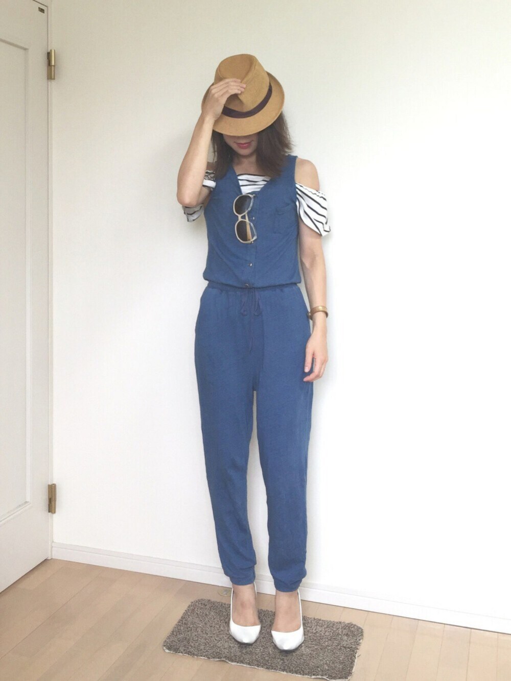 見ていただきありがとうございます❤️ お昼は蒸し暑いですね😣 一足早く夏気分✨ オフショル可愛いけどがっつり肩出すのはアラサーは抵抗あったのでオールインワンのインナーにしてみました😊 しまむらで見つけたオールインワンは柔らか素材で楽チン😋 久々に白パンプス😁 いつもいいね、save、フォローありがとうございます❤️