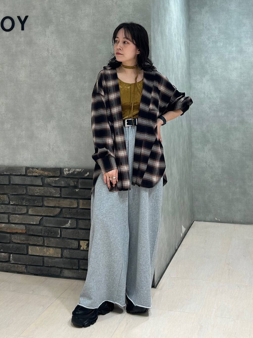 店頭でも大人気のコーデ🙌 【トップス】 マストアイテムのチェックシャツ! ガーゼ織で軽く羽織れる&シワにならないのが最高です👍 朝羽織って→昼脱いで腰に巻いて→夜また羽織る が今の時期にもってこい🙌 まだ持っていない方は要チェックです✅ 【ボトムス】 156センチでMサイズ着用しています! 生地が薄めでゆったりシルエットなのでとっても着やすい🫶 裾がすぼまったスウェットパンツだとパジャマっぽくなりそうで不安、、という方はワイドシルエットがオススメです👍