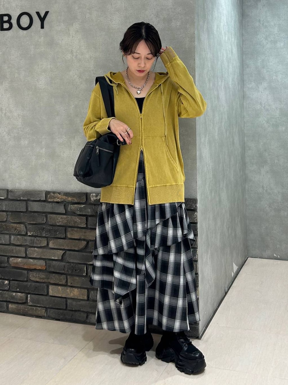 カジュアルガーリーコーデ🎃 【トップス】 薄くて柔らかいニット素材のWZIPパーカー🫶 裏毛パーカーのようなハリ感はなく、クタッと柔らかく落ち感があるのが特徴です🌻 大きめフードが肩幅カバーしてくれるのもポイント高い🙆♀️ 156センチでおしりすっぽり隠れるくらいなので、ボトムスとのバランスも取りやすい! 【ボトムス】 普段あんまり甘め着ない方でも、トップスがカジュアルなら着やすい🌸 ショートトップスと合わせてティアードのボリューム感を楽しんでも良し、わたしみたいに長めトップスでスカートのボリュームを抑えてもかわいいですよ🌝