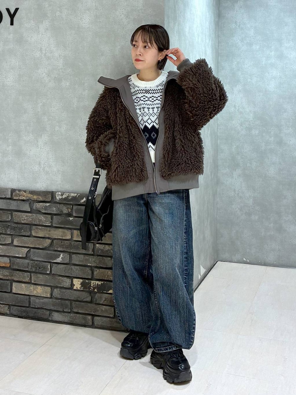 ▼各アイテムおすすめポイント▼ 【アウター】 リバーシブルで着用可能🫶 毛足長めのファーはとっても触り心地が良くて、このボリューム感たまらん🤤 156センチでちょうどお尻が隠れる着丈です! 真冬の強い味方アウター💪 【ニット】 この時期着たくなるノルディック柄🎄 ページボーイらしいショート丈で、カジュアルになりすぎず着ていただけます🌷 生地はしっかりめなので暖かい❤️🔥 【ボトムス】 156センチMサイズ着用! ユニセックスアイテムなので、ウエストもゆったりでとっても着やすい🥰 普段Sサイズ着用される方はウエスト少し落ちると思うのでベルトであげると◎