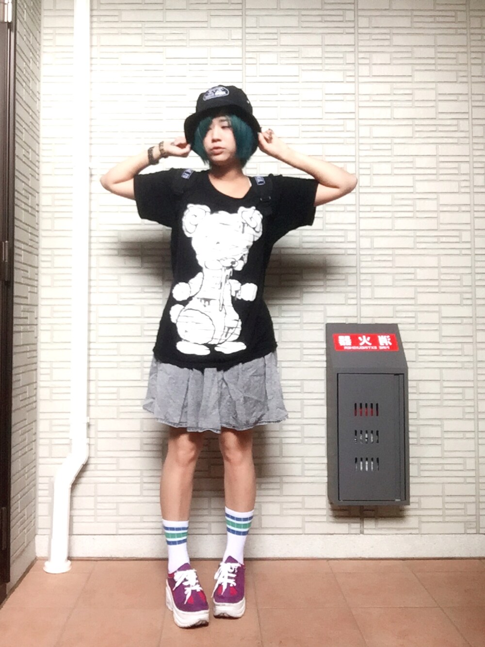 髪の毛をセルフで青緑にしました〜! 暑いと思ってTシャツ楽チンコーデにしましたが、一枚羽織っても良かったな… よだれべあー かわいいよ!!!