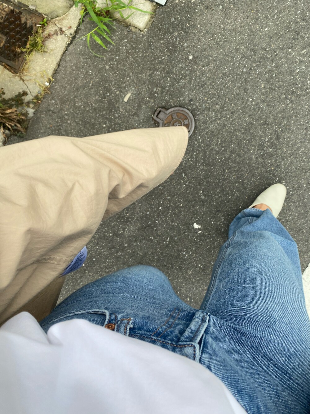ブルー系のデニムパンツ、ホワイト系のパンプスを着用したレディースの夏コーディネートの1枚目の写真